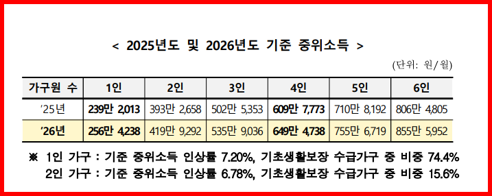 2026년 기준 중위소득은 다음과 같이 인상됐습니다.