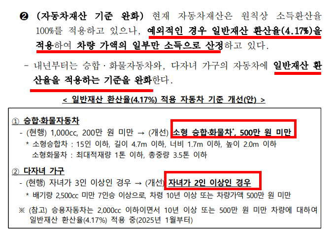 기존에는 자동차 가액 전액을 소득으로 환산했지만, 예외적으로 일반재산 환산율 4.17%를 적용한 경우도 있었습니다. 2026년부터는 적용 기준이 완화됩니다.