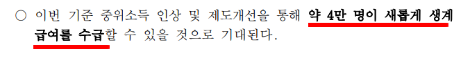 이번 기준 중위소득 인상과 제도 개선을 통해 약 4만 명이 새롭게 생계급여 수급 대상이 될 것으로 예상됩니다.